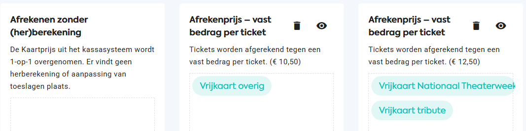 De Theatertoeslag wordt verlaagd met een vast bedrag per ticket. Dit bedrag kan worden ingesteld.